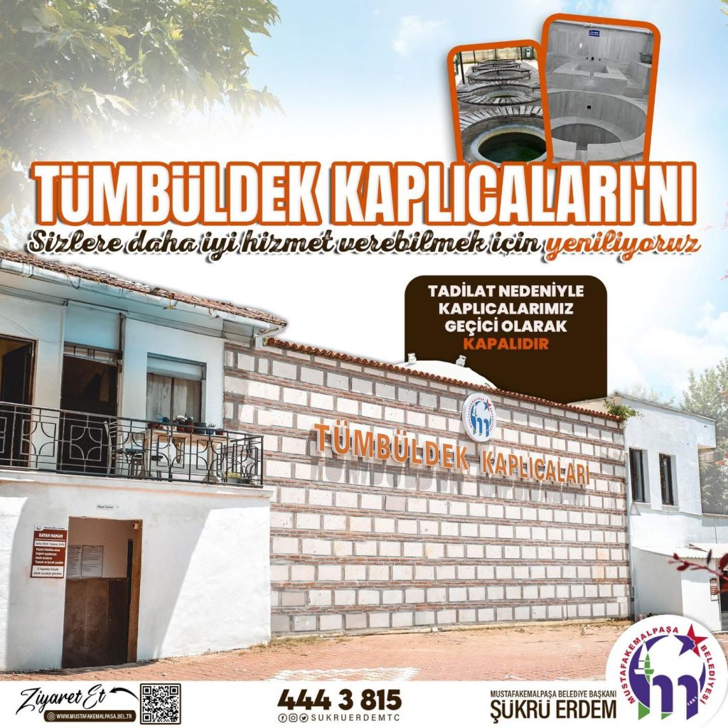 Mustafakemalpaşa’nın önemli termal turizm merkezlerinden biri olan Tümbüldek Kaplıcaları, bakım ve iyileştirme çalışmaları nedeniyle kısa süreliğine hizmete ara veriyor.