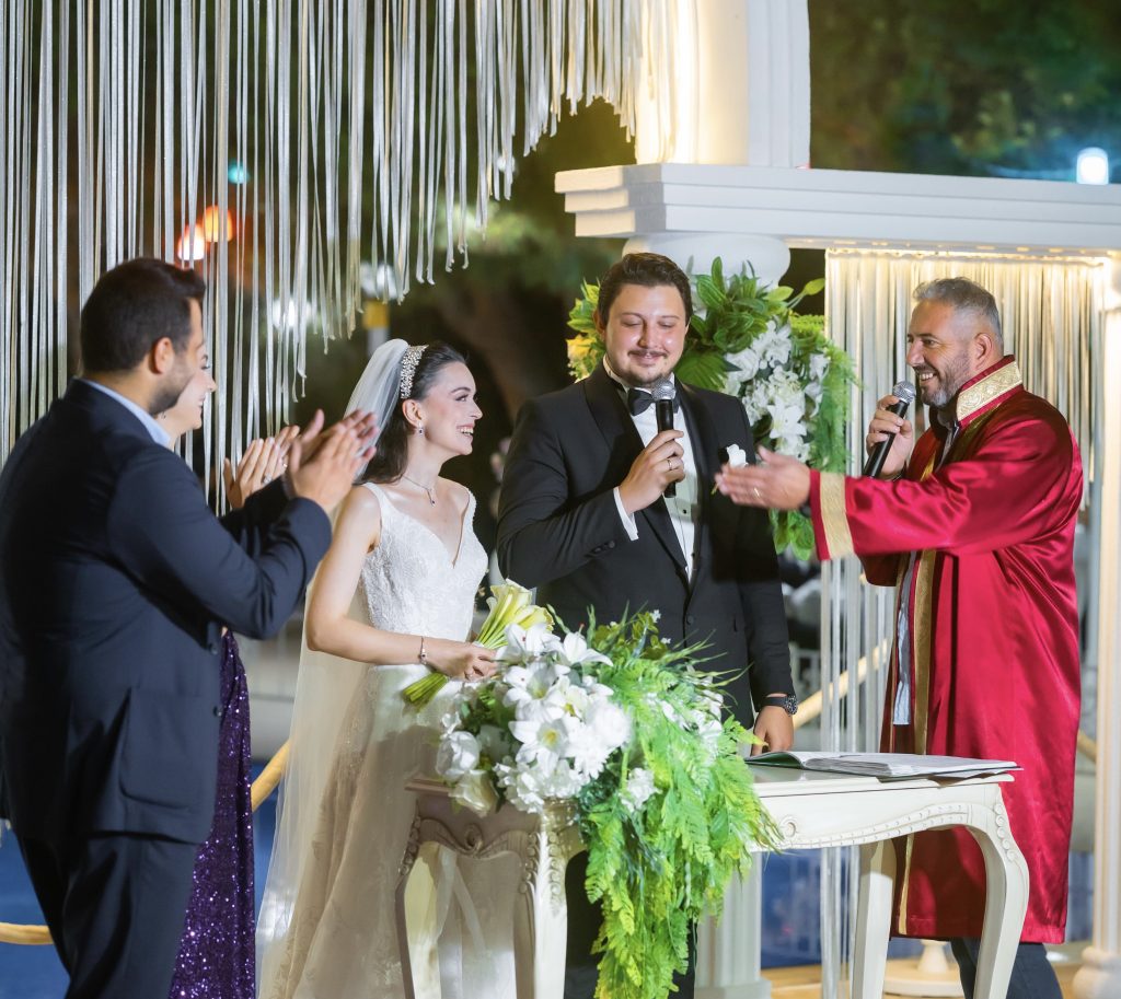Saat 20.45’te gelin ve damadın salona girişleriyle coşku doruğa ulaştı. Alkışlar arasında gerçekleşen nikâh törenini Mustafakemalpaşa Belediyesi nikâh memuru Tamer Kayhan kıyarken, nikâhın ardından çifte ilk danslarında konuklar da eşlik ederek mutluluklarına ortak oldu.