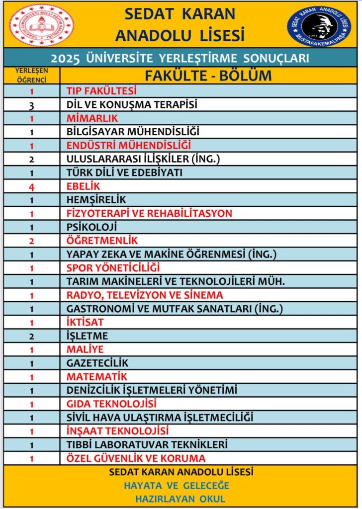 2021 yılından bu yana sınavla öğrenci alan ve akademik başarıda istikrarlı yükselişini sürdüren SKAL, yalnızca üniversite sonuçlarıyla değil, LGS sonrası tercih döneminde de öne çıktı. 2025-2026 Eğitim-Öğretim Yılı’nda Mustafakemalpaşa’da 90 öğrencinin tercihi Sedat Karan Anadolu Lisesi oldu.