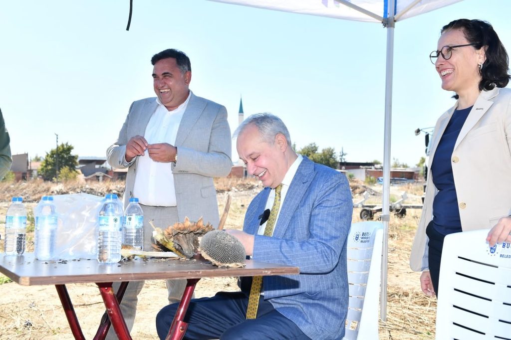 Nisan ayında toprakla buluşturulan ayçiçeklerinin ilk hasadına Belediye Başkanı Şükrü Erdem, Belediye Başkan Yardımcıları Derya Deniz Kanar ve Emine Argın ile birlikte katıldı.