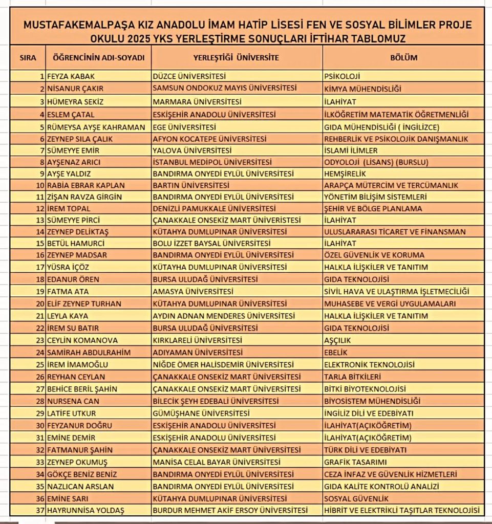 Mustafakemalpaşa Kız Anadolu İmam Hatip Lisesi Fen ve Sosyal Bilimler Proje Okulu, 2025 Yükseköğretim Kurumları Sınavı (YKS) sonuçlarıyla dikkatleri üzerine çekti.