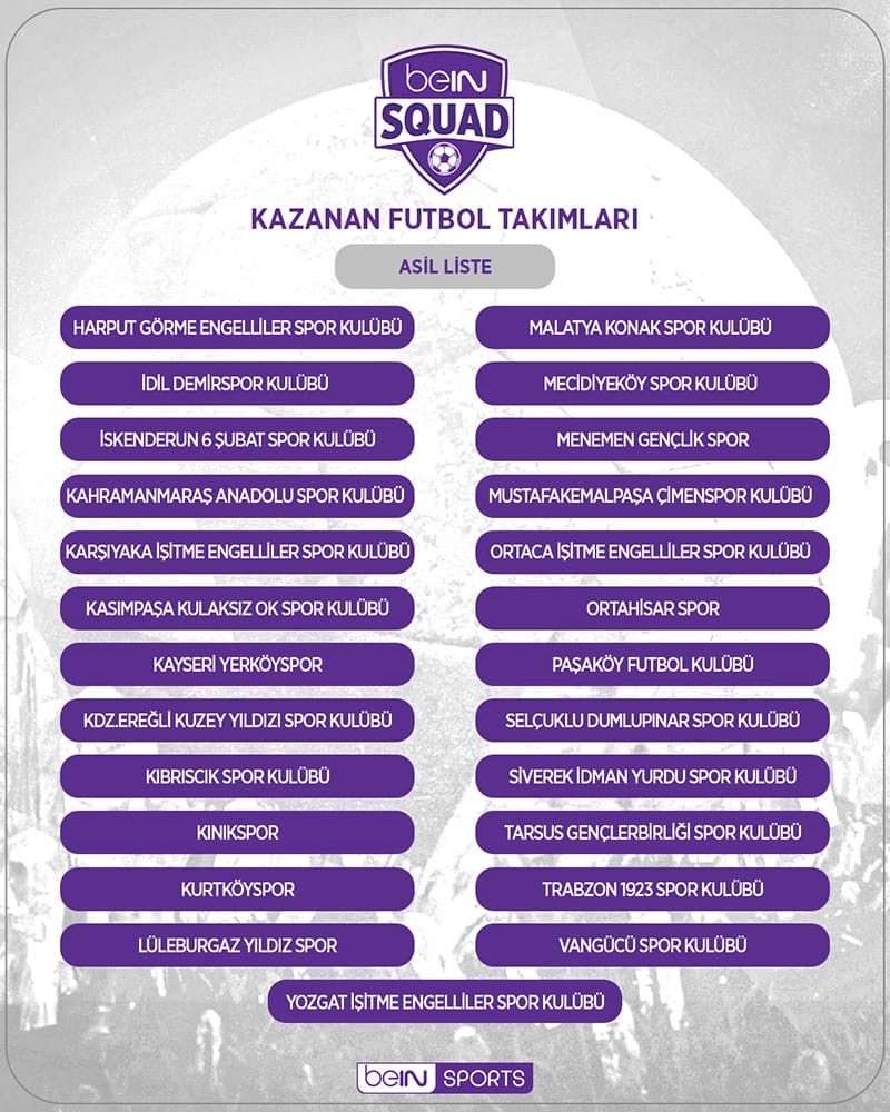 beIN SQUAD projesi kapsamında destek alan kulüpler, sezon boyunca beIN SPORTS’un web sayfası, sosyal medya hesapları ve yayınlarında kendilerine özel içeriklerle yer alma fırsatı bulacak.