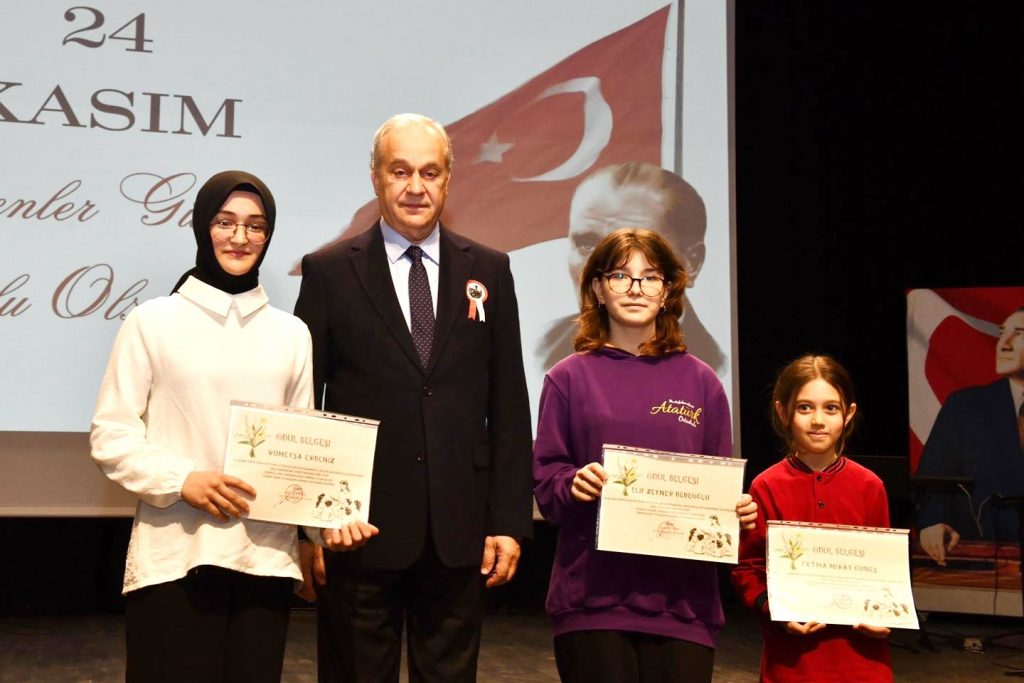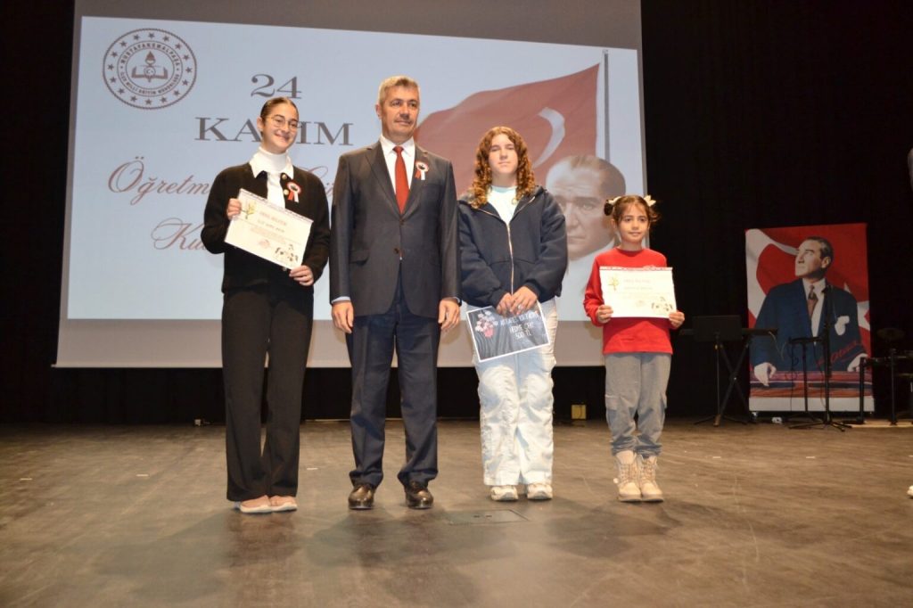 24 Kasım kapsamında düzenlenen yarışmalarda dereceye giren öğrenci ve öğretmenler de ödüllerini protokol üyelerinin elinden aldı.