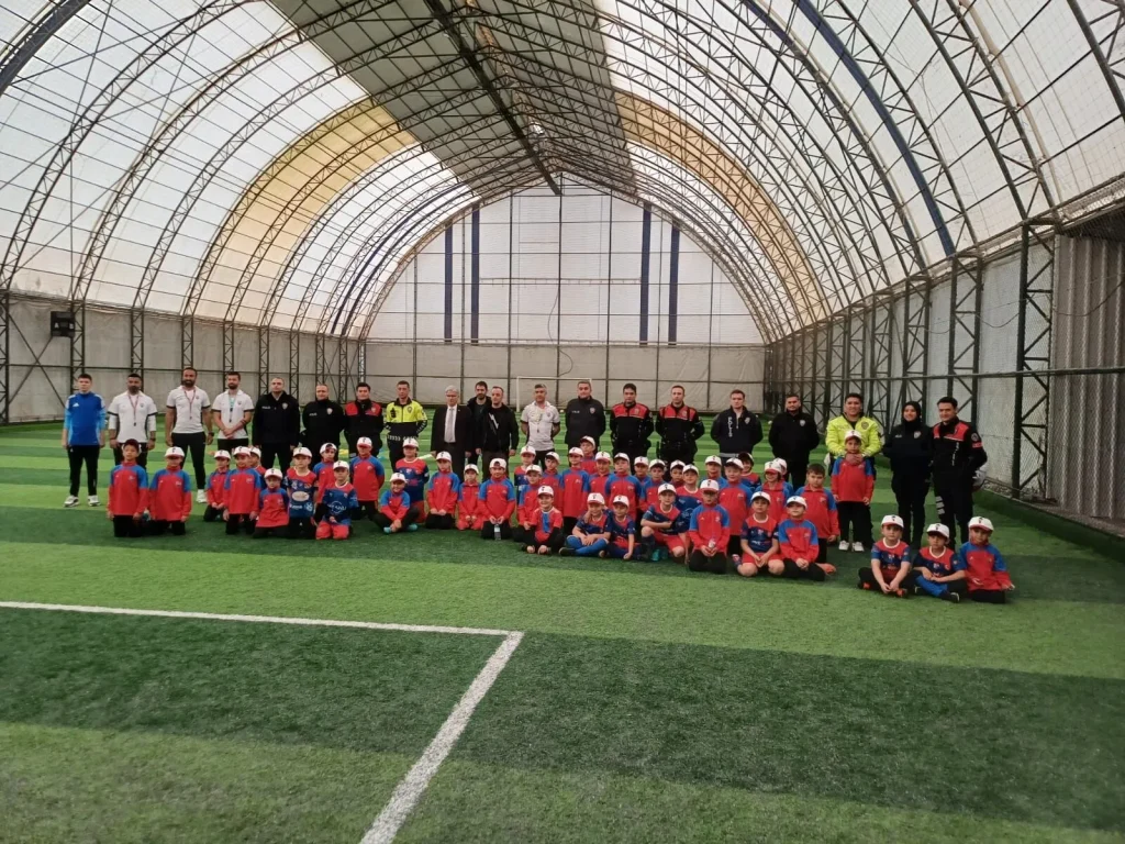 Mustafakemalpaşa İlçe Emniyet Müdürlüğü’ne bağlı ekipler, Asayiş Şube Başkomiserlerinden Burak Ramazan Akşen öncülüğünde Mustafakemalpaşa Futbol Okulu’nu ziyaret ederek geleceğin sporcularıyla bir araya geldi. Antrenman öncesinde gerçekleştirilen etkinlikte, genç futbolcular polis ekiplerini sahada anlamlı bir sürprizle karşıladı. Spor malzemeleriyle sahanın ortasına “POLİS” yazan çocuklar, büyük alkış aldı.