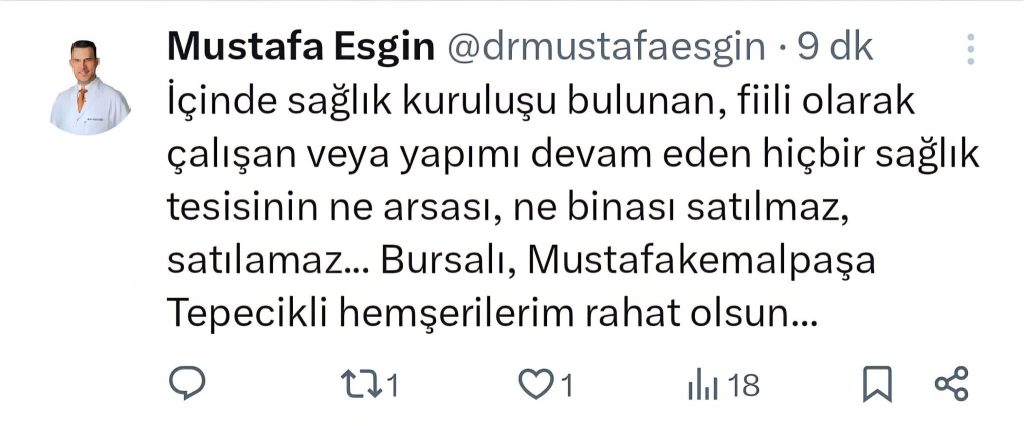 Tartışmalar sürerken, yapılması planlanan basın açıklamasına kısa süre kala önceki dönem AK Parti Bursa Milletvekili Mustafa Esgin’den açıklama geldi. Esgin, sosyal medya üzerinden yaptığı paylaşımda sağlık kuruluşlarının satılamayacağını belirterek vatandaşların içinin rahat olması gerektiğini ifade etti.